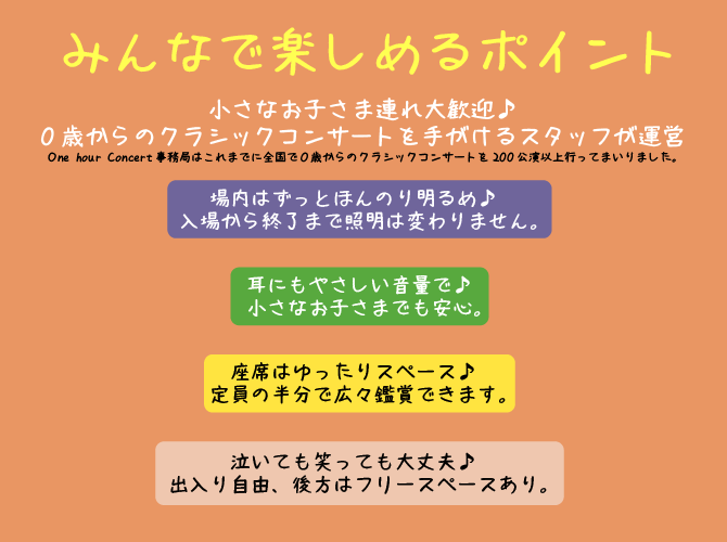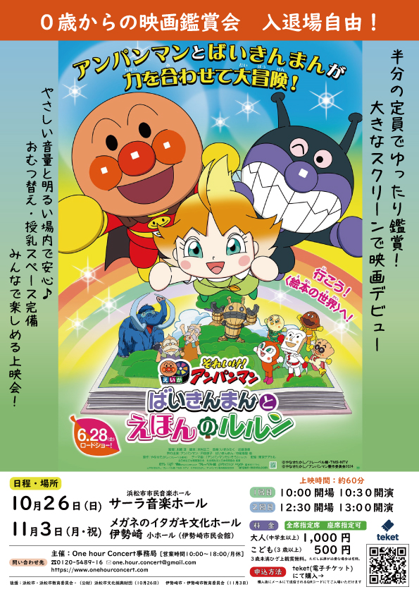 SNSでシェアする Tweet シェア 0歳からの映画鑑賞会 ~それいけ!アンパンマン ばいきんまんとえほんのルルン~ 伊勢崎会場 公演日 2025/11/03(月) 公演時間 10:30~11:30 公演日 2025/11/03(月) 公演時間 13:00~14:00 会場 メガネのイタガキ文化ホール伊勢崎 小ホール(伊勢崎市文化会館) 料金 大人 ¥1,000 料金 こども(3歳~12歳) ¥500 備考 3歳未満の膝上鑑賞チケット不要、無料全席指定、キャンセル不可です。 チケット予約する プログラム 定員の半分でゆったり鑑賞! 映画デビューに最適な入退場自由♪ ~映画アンパンマンはお子さまの≪映画デビュー≫を応援!~ ★短めの上映時間(約60分)とやさしい音量♪ ★上映中もまっくらじゃない!場内の照明は明るめ! Tweet シェア
