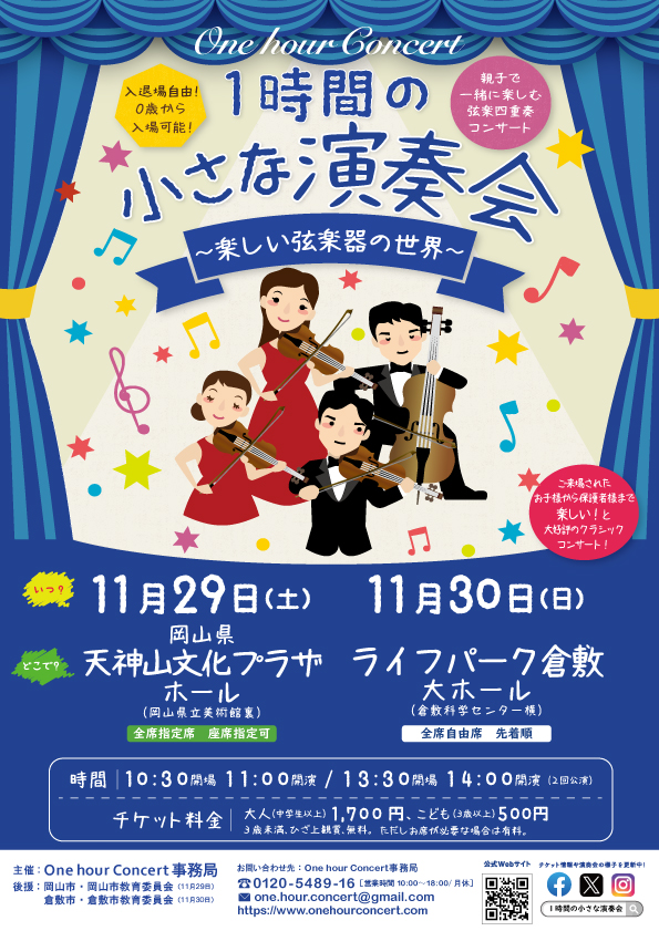SNSでシェアする Tweet シェア 楽しい弦楽器の世界倉敷公演 公演日 2025/11/30(日) 公演時間 11:00~12:00 公演日 2025/11/30(日) 公演時間 14:00~15:00 会場 ライフパーク倉敷 大ホール 料金 大人 ¥1,700 料金 こども(3歳~12歳) ¥500 備考 3歳未満の膝上鑑賞無料 チケット予約する プログラム 1時間にクラシック・アニメソング・童謡唱歌など楽しめる楽曲をギュッと詰め込みました! 今年は大好評につき2回公演です。 ・ヴィヴァルディ/ 四季より ・楽器のおはなし ・ジブリアニメ・ アンパンマンの音楽など数曲 他 Tweet シェア 出演者紹介 ヴァイオリン 田中 大輔 TANAKA DAISUKE ヴァイオリン 矢部 美紀子 YABE MIKIKO ヴィオラ 長久保 愛 NAGAKUBO MEGUMI チェロ 宮澤 等 MIYAZAWA HITOSHI
