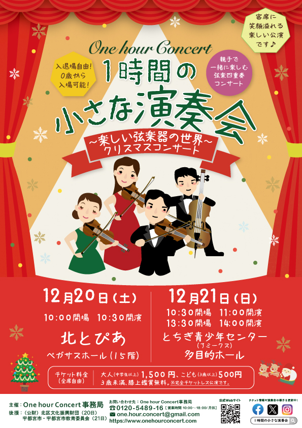 SNSでシェアする Tweet シェア 楽しい弦楽器の世界クリスマスコンサート北とぴあ公演 公演日 2025/12/20(土) 公演時間 10:30~11:30 会場 北とぴあ ペガサスホール 料金 大人 ¥1,500 料金 こども(3歳~12歳) ¥500 備考 3歳未満の膝上鑑賞無料 チケット予約する プログラム 1時間にクラシック・アニメソング・童謡唱歌など楽しめる楽曲をギュッと詰め込みました! ・ヴィヴァルディ/ 四季より ・楽器のおはなし ・ジブリアニメ・ アンパンマンの音楽など数曲 他 Tweet シェア 出演者紹介 ヴァイオリン 田中 大輔 TANAKA DAISUKE ヴァイオリン 矢部 美紀子 YABE MIKIKO ヴィオラ 長久保 愛 NAGAKUBO MEGUMI チェロ 久武 麻子 ASAKO HISATAKE