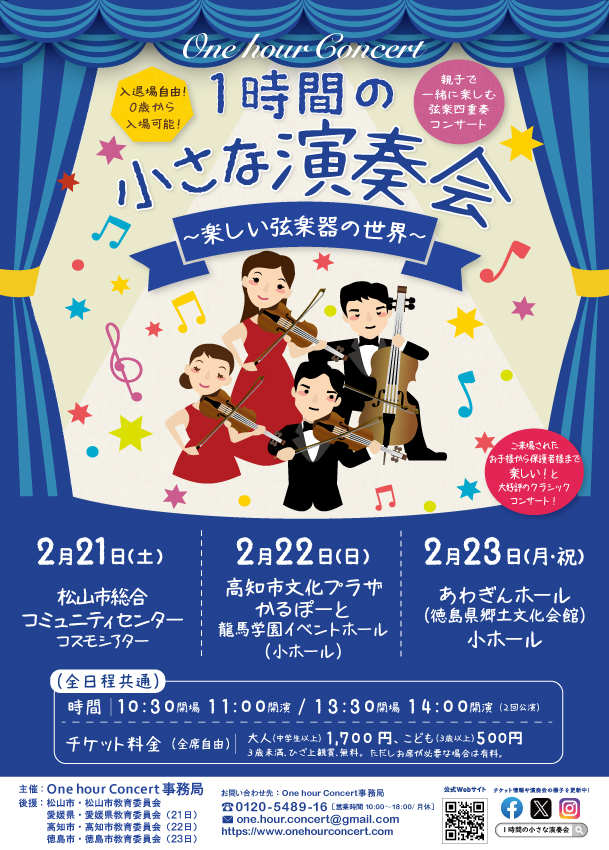 SNSでシェアする Tweet シェア 楽しい弦楽器の世界高知公演 公演日 2026/02/22(日) 公演時間 11:00~12:00 公演日 2026/02/22(日) 公演時間 14:00~15:00 会場 高知市文化プラザかるぽーと 小ホール 料金 大人 ¥1,700 料金 こども(3歳~12歳) ¥500 備考 3歳未満の膝上鑑賞チケット不要、無料 チケット予約する プログラム 1時間にクラシック・アニメソング・童謡唱歌など楽しめる楽曲をギュッと詰め込みました! ・ヴィヴァルディ/ 四季より ・楽器のおはなし ・ジブリアニメ・ アンパンマンの音楽など数曲 他 Tweet シェア 出演者紹介 ヴァイオリン 田中 大輔 TANAKA DAISUKE ヴァイオリン 矢部 美紀子 YABE MIKIKO ヴィオラ 長久保 愛 NAGAKUBO MEGUMI チェロ 宮澤 等 MIYAZAWA HITOSHI
