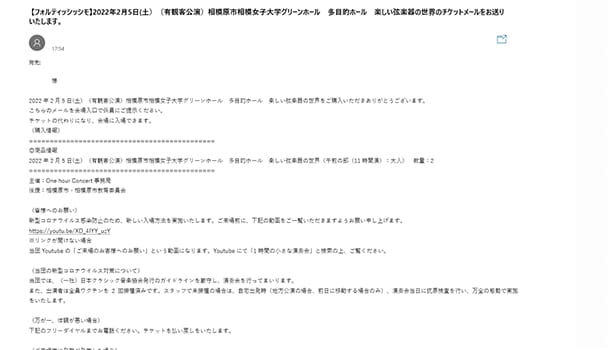 「チケットメール」を提示チケットメールを演奏会会場の受付に提示の上、ご入場ください。